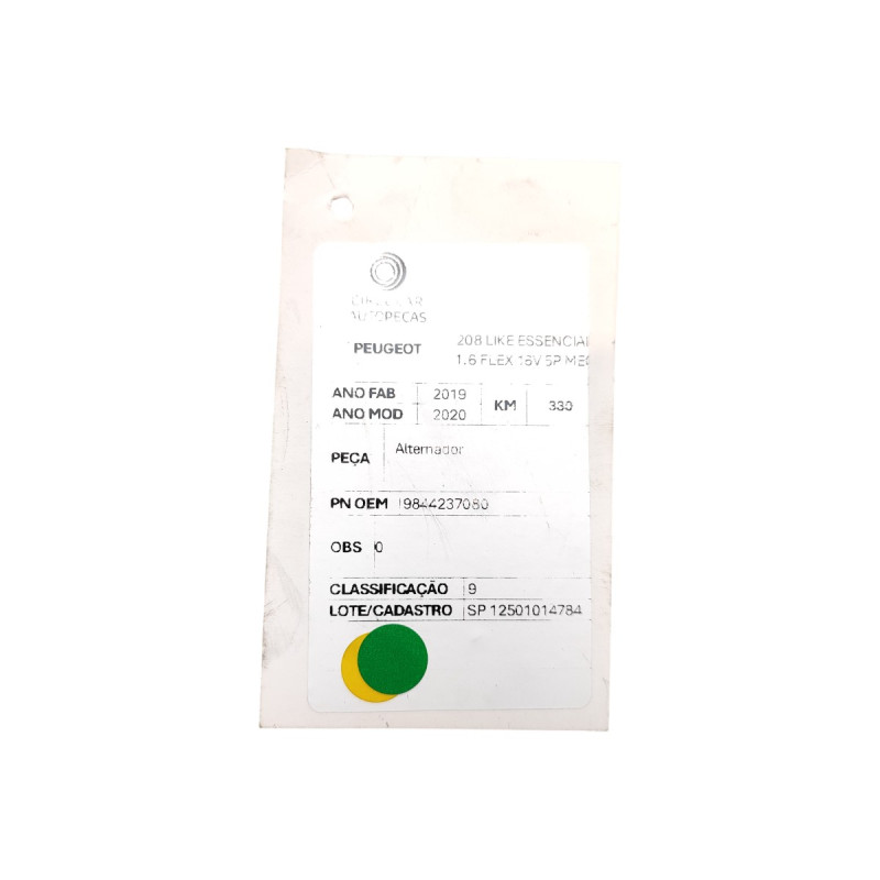 ALTERNADOR PEUGEOT 208 LIKE ESSENCIAL 1.6 FLEX 16V 5 PORTAS CÂMBIO MANUAL 2019/2020