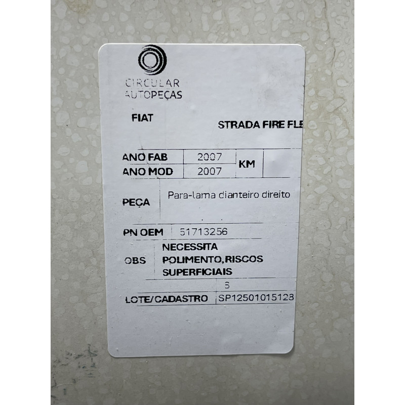 PARA-LAMA DIANTEIRO DIREITO FIAT STRADA MPI FIRE BRANCO 2007