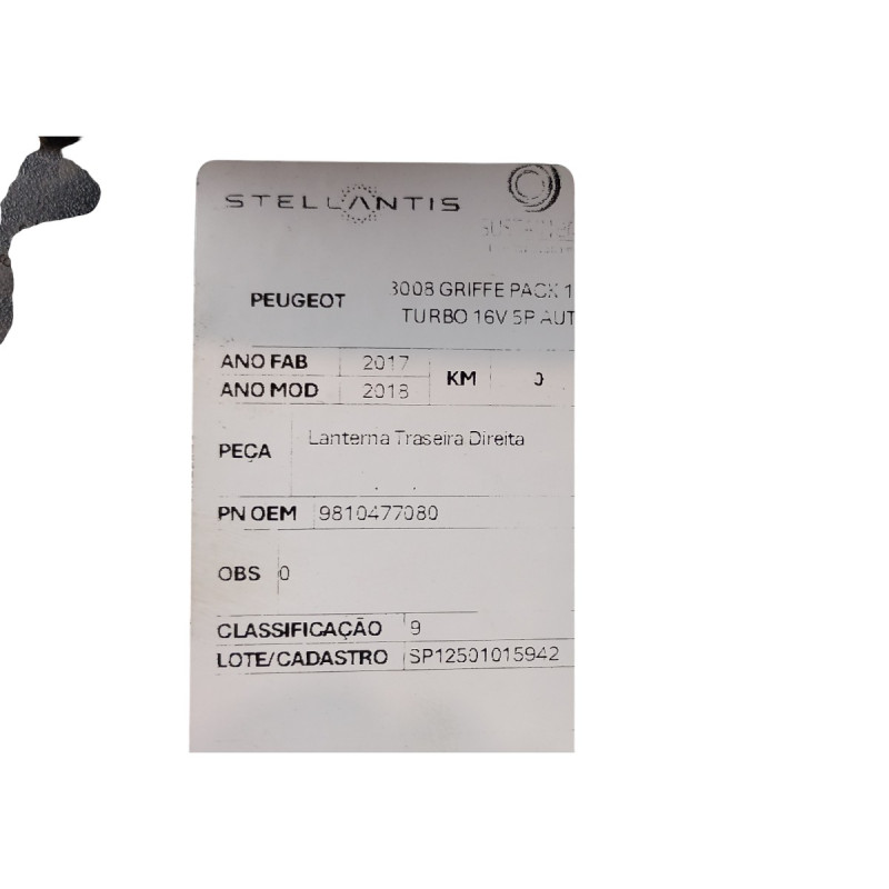 LANTERNA TRASEIRA DIREITA PEUGEOT 3008 GRIFFE PACK 1.6 TURBO 16V 5P AUTOMÁTICO 2017/2018